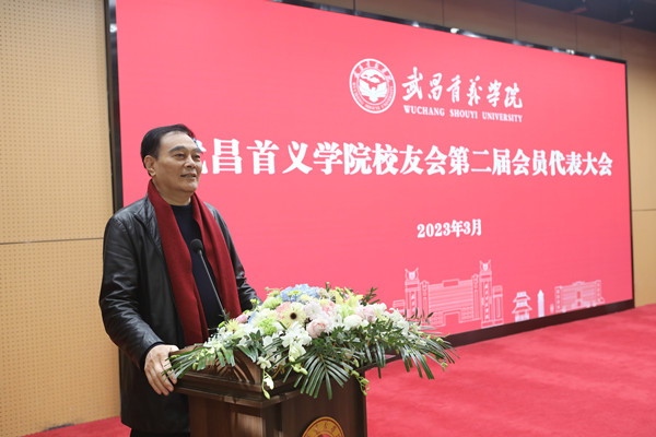 新任会长、理事长金国华讲话。他首先向新当选的校友会第二届负责人、理事表示祝贺,向会员代表们对自己的信任表示感谢。他深情回顾了办学20余年来经历的困难、取得的成绩。他谈到,自己在办学中始终坚持处理好“四大关系”,即名大于利、感情大于金钱、精神大于物质、政治大于一切,秉持“四个提高”,即提高管理水平、提高人才培养质量、提高服务意识、提高员工待遇。他表示,自己最欣慰的是看到学校培养的众多优秀毕业生,在与名校学生竞争比拼中不仅毫不逊色,脱颖而出者更是不胜枚举。广大毕业生在社会各行各业拔节生长,在实现人生理想的同时,为国家经济社会发展贡献了首义学子的积极力量。金国华感谢为学校教育事业发展辛勤付出、默默奉献的师生员工,希望广大校友为推进学校教育事业高质量发展建言献策,并欢迎广大校友常回母校看看。