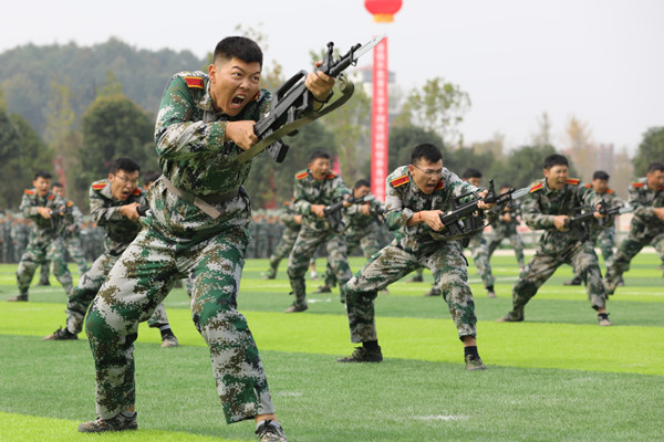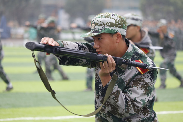 “莫间前途何方,只为驰骋沙场,长枪紧握不放,以护家国安康。” 军训汇报表演在嘹亮的口号声中正式开始。由信息科学与工程学院和机电与自动化学院56名男生带来的刺杀操表演整齐划一,刚劲有力。只见他们手握钢枪,一出一收,刺杀之间,虎虎生威,震慑灵魂的呐喊经久不息,彰显了首义男儿蓬勃向上的时代风采。精彩的表演赢得场下观众们阵阵喝彩。